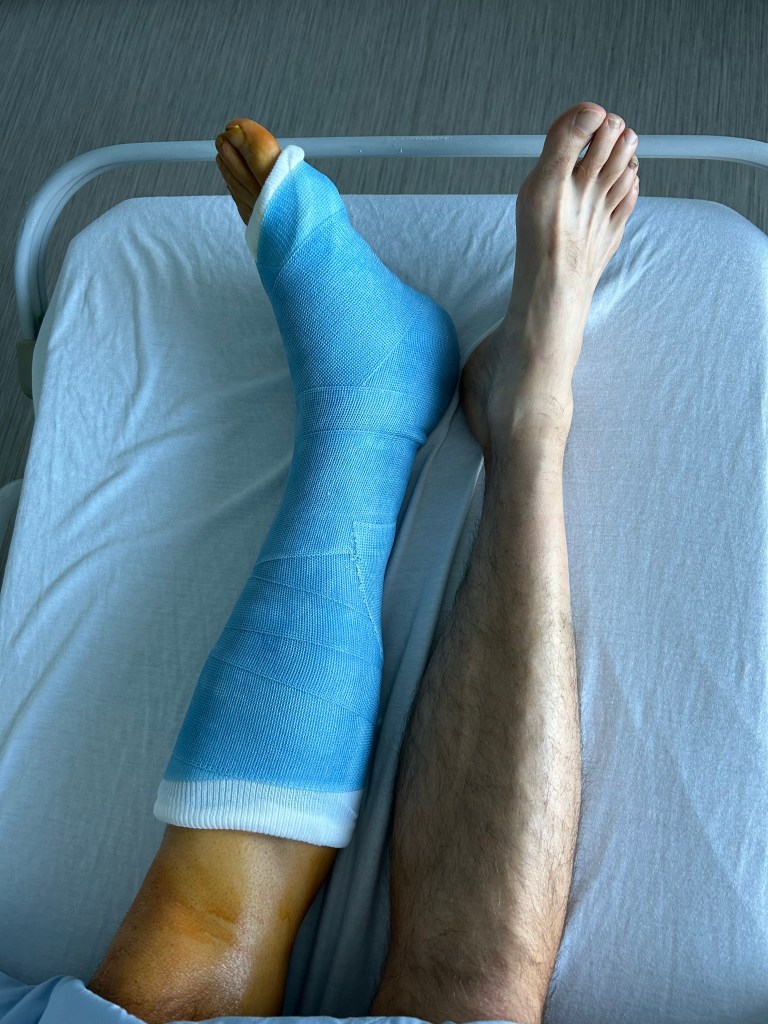 Période de 6 semaines avec botte en résine qui bloque le pied soit 44 jours avec chaque jour 1 séance d’environ 1 heure d’exercices sur chaise avec des exercices de mobilité, d’abdominaux et de renforcement du haut du corps, ainsi qu’une sortie avec béquilles d’environ 30 minutes pour un peu de travail cardio-vasculaire.