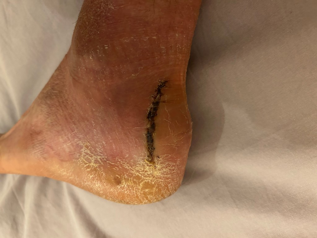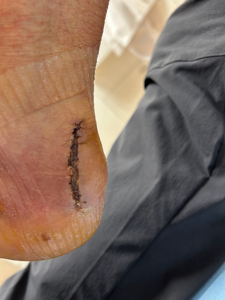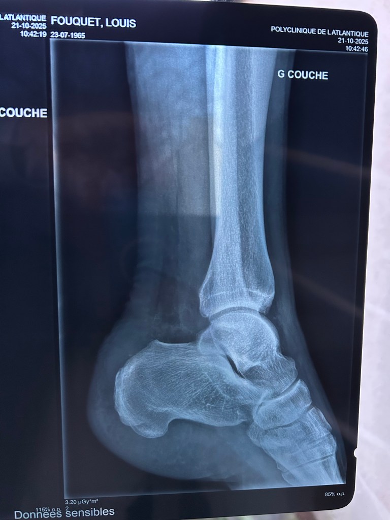 L’opération chirurgicale est décidée avec le Docteur PERRIER et programmée pour le 29 septembre 2025. Ce sera dans un 1er temps pour le pied gauche, celui qui me fait le plus souffrir. L’intervention est réalisée sous rachianesthésie, en position décubitus latéral, avec une ouverture externe verticale de 4 à 5 cm le long du bord antérieur de l’insertion du tendon d’Achille, qui permet de mettre en évidence la tendinopathie d’insertion, puis un débridement du tendon d’Achille pour la réalisation d’une ténosynovectomie antérieure du tendon. (Intervention qui vise à retirer les parties lésées de la gaine des tendons à la base de l’inflammation). Suis alors une ostéotomie du bord postérosupérieur du calcanéum à la scie complétée à la fraise. L’opération aura duré environ 1 heure. Je sors de la clinique vers 15 heures avec une botte en résine des orteils jusqu’à la base du genou. Elle me bloque la cheville à environ 90°.